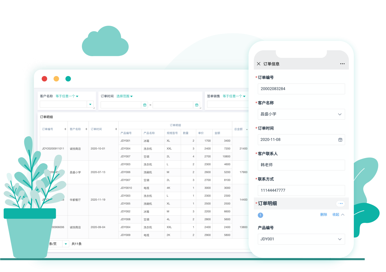 现在的简道云订单管理:电脑手机都可以录入订单,员工可在线查询、分析。