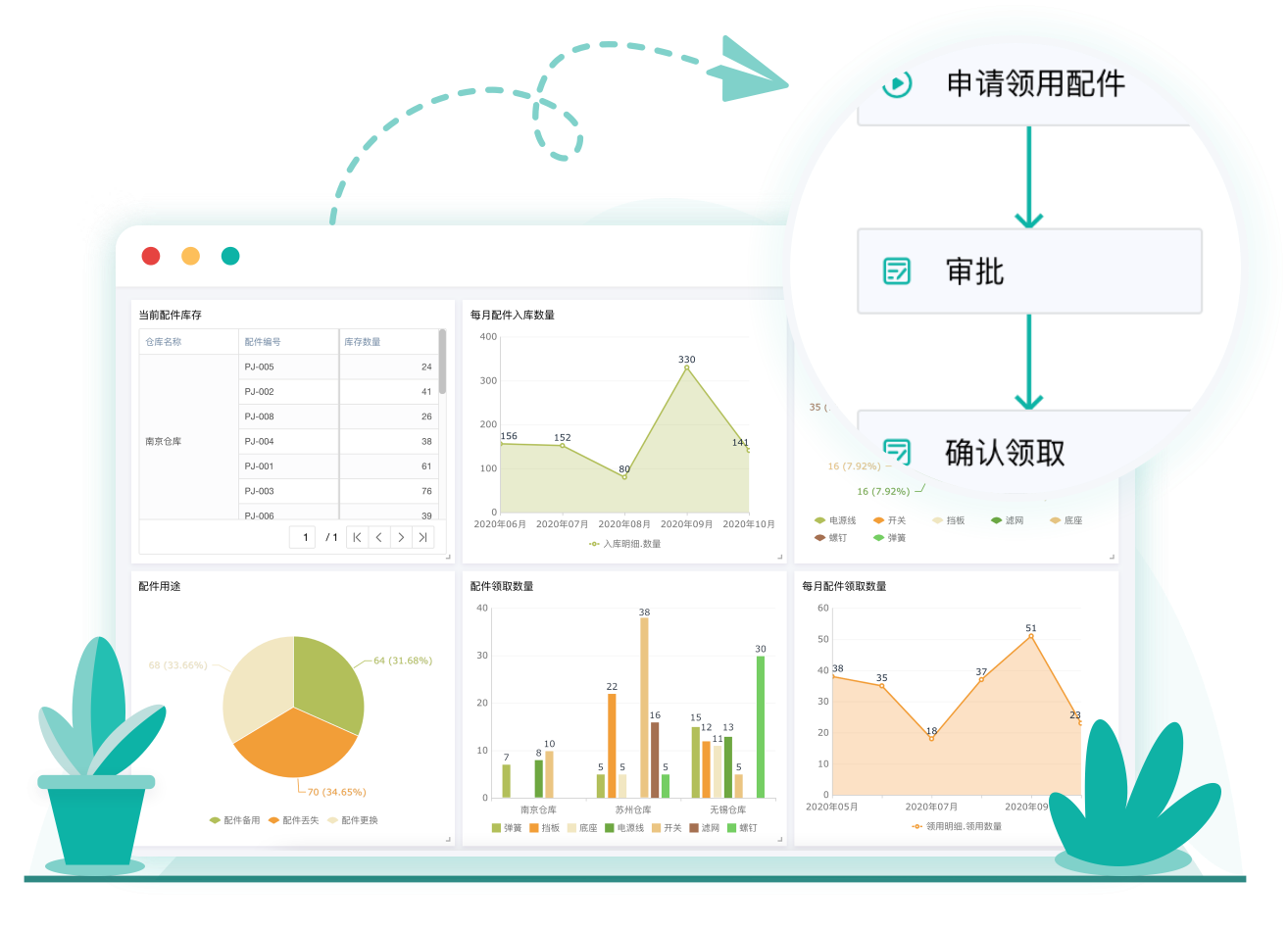 现在的简道云配件管理:清晰记录分析配件的入库、领用、成本等情况;库存实时更新,数量不足自动提醒。