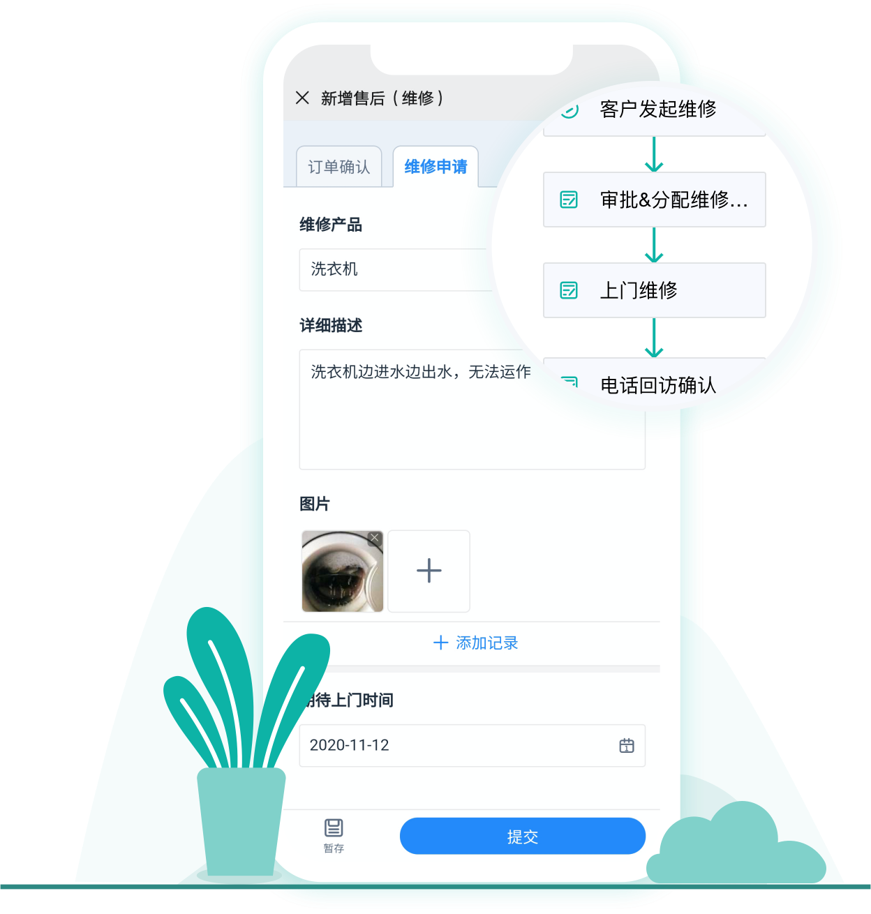 现在的简道云管理:在线发起订单的维修、退款流程,自动提醒责任人。