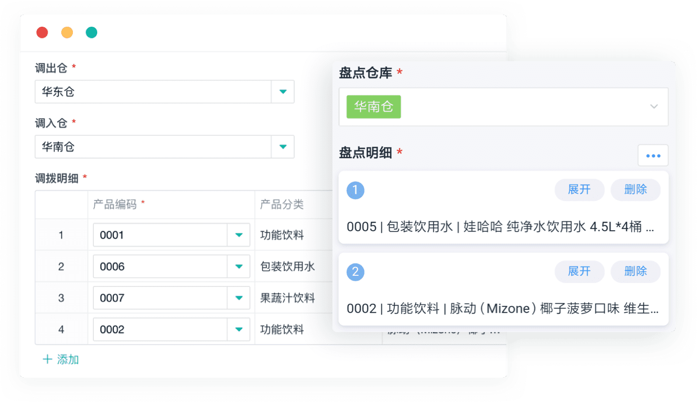 • 记录入库、出库、货物在仓库之间的调拨记录,实时统计当前仓库库存。