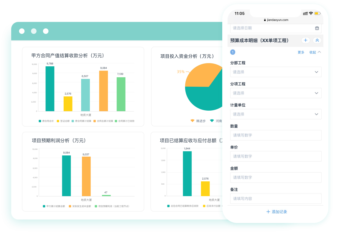核心解决工程对甲方、供方商务对接的难题,保证结算与计量及时准确。线上化成本分析,自动计算项目的动态利润,通过商务手段提升项目利润率。