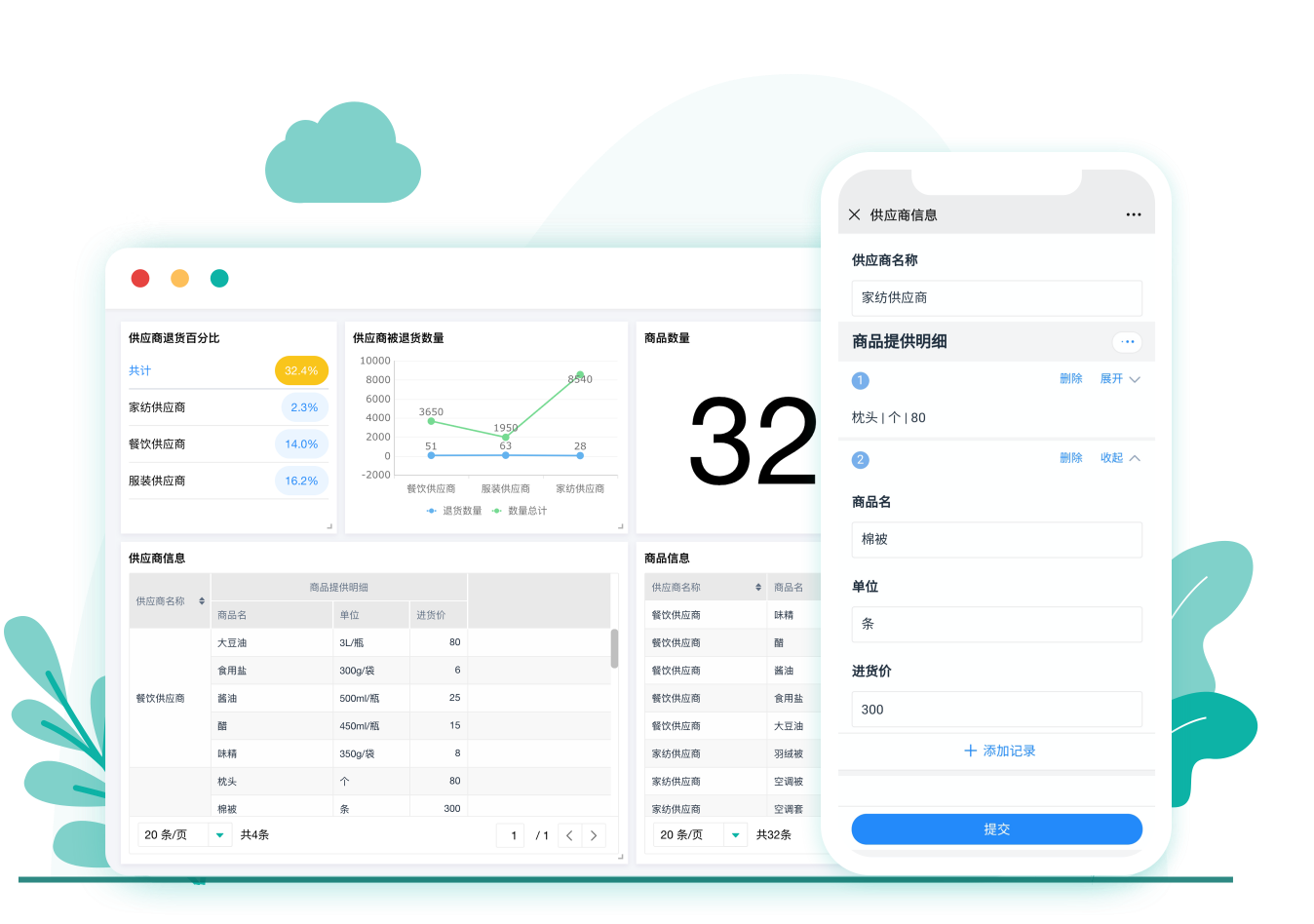 现在的简道云供应商管理:建立供应商及商品信息库,增加退货统计,评估分析各家退货数量及比重,确保服务质量。