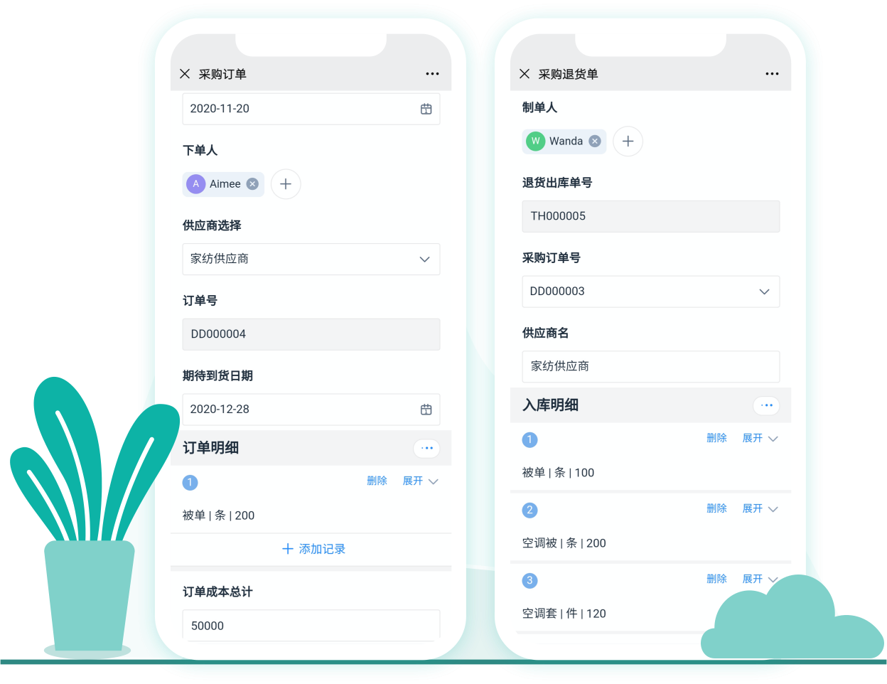 现在的简道云供应链管理:在线发起采购、入库、退货流程。